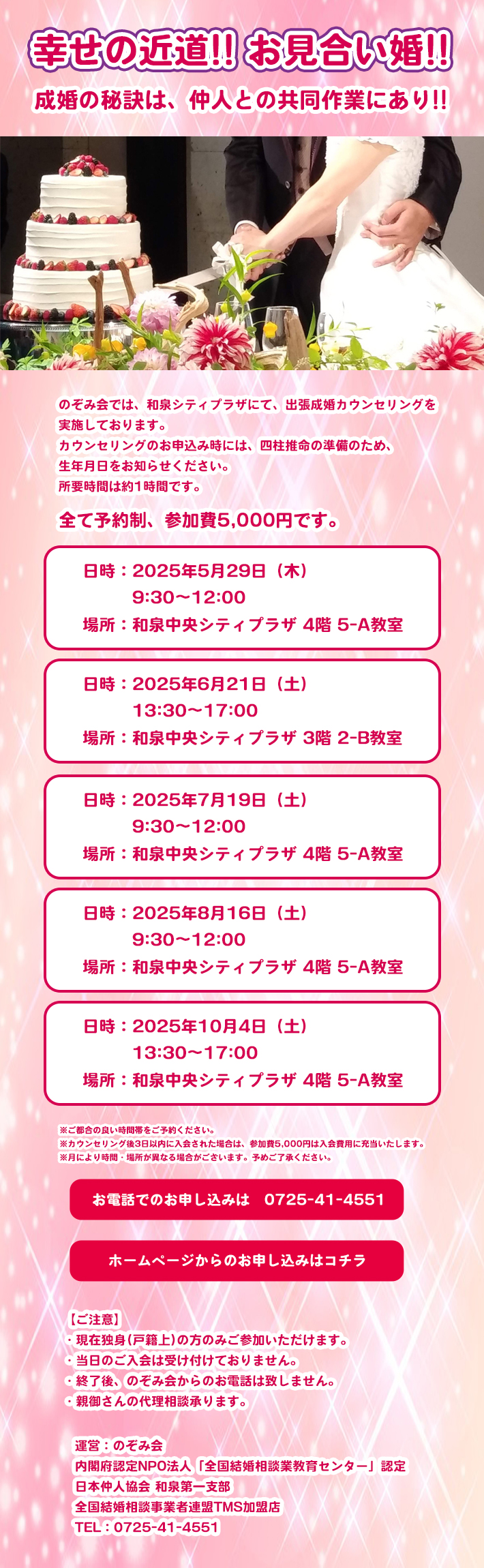 ◆ トップページ  ◆ のぞみ会とは  ◆ 料金  ◆ 成婚までの流れ  ◆ ブログ  ◆ お問い合わせ